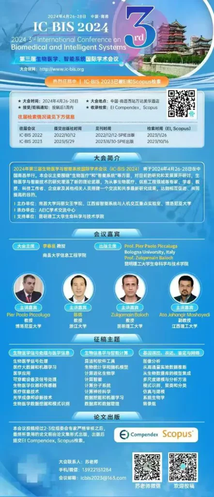 The 3rd International Conference on Biomedical and Intelligent Systems (IC-BIS 2024) will be held from April 26-28, 2024, in Nanchang, China. This conference provides a platform for researchers and professionals in the fields of biomedical engineering and intelligent systems to share their latest developments. It aims to foster collaboration and promote the exchange of innovative ideas in these rapidly evolving fields.